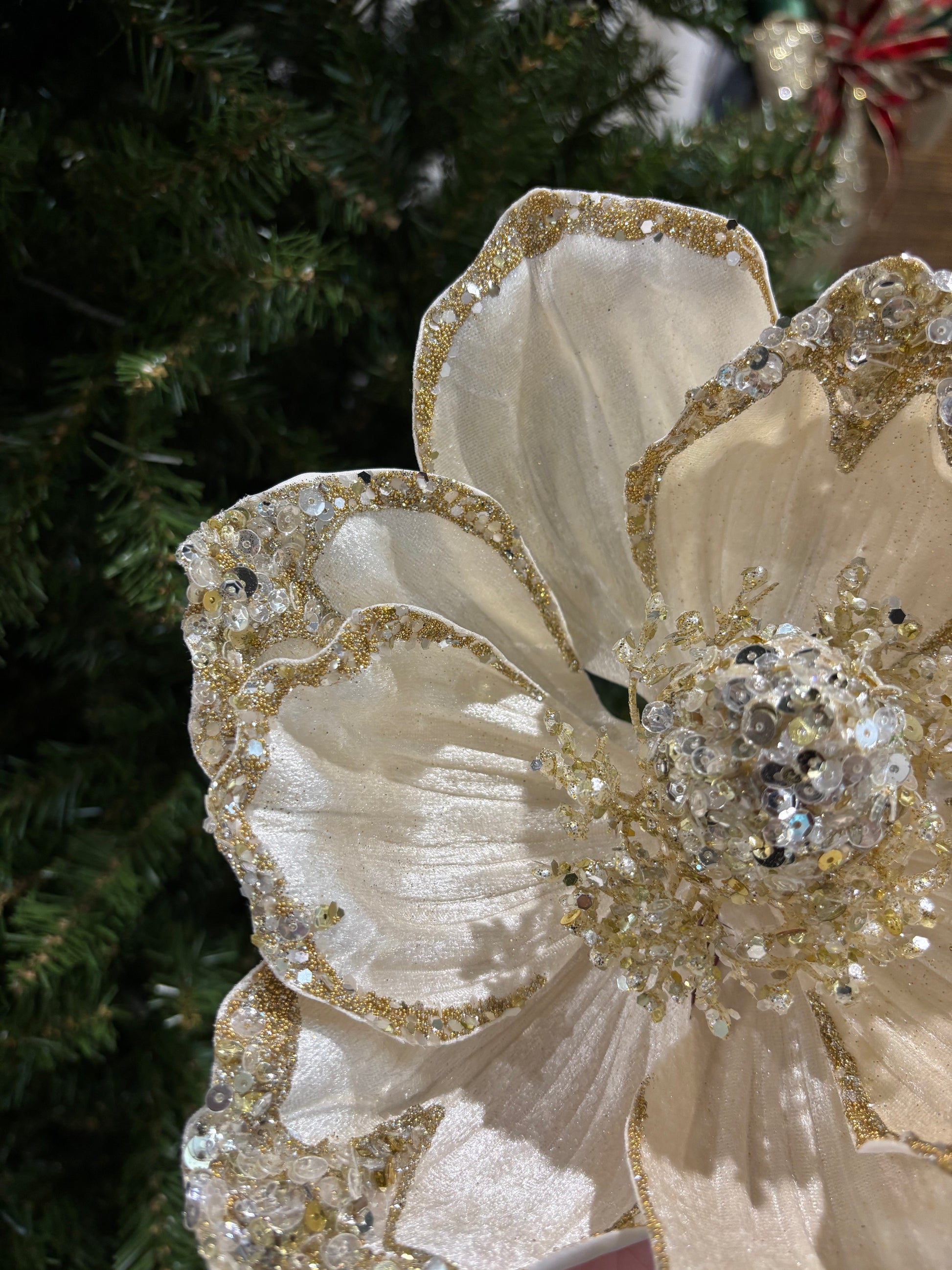 This ivory magnolia flower is detailed with sparkling sequins, beads and glitter. The petals are velvety soft to the touch. Flower comes affixed to a 24" stem.